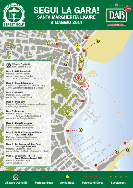Sede di premiazione: ore 19, presso Miami Beach-La Valletta, via Milite Ignoto, S. Margherita Ligure. In caso di forte maltempo la manifestazione sarà rinviata, ed i pre-iscritti saranno preventivamente informati. L’evento è organizzato dal Comune di S. Margherita Ligure in collaborazione con la Pro Loco, il Circolo Golf e Tennis di Rapallo, e con l’organizzazione tecnica di StreetGolf TM.